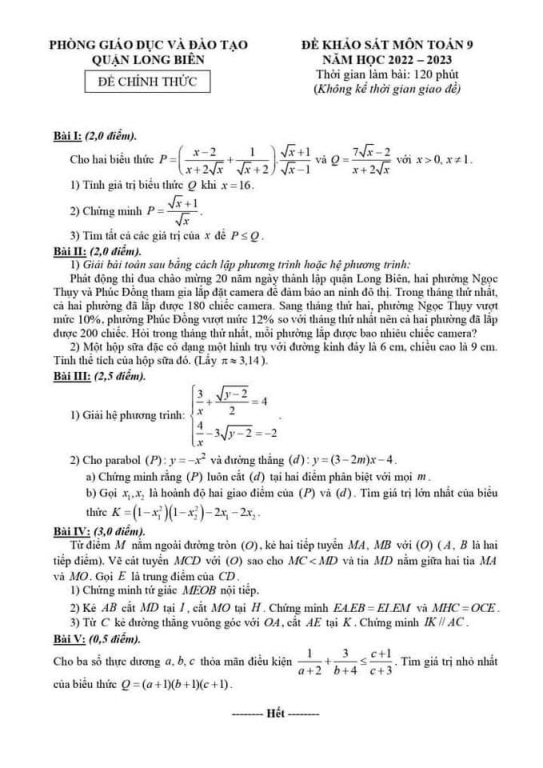 Đề thi khảo sát Toán lớp 9 phòng GD&ĐT Quận Long Biên | năm học 2022 - 2023