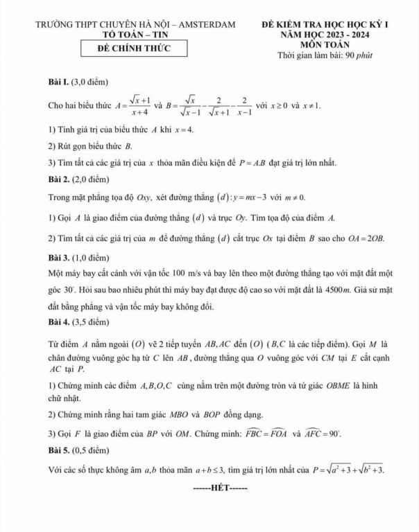 Đề thi môn toán cuối kỳ 1 lớp 9 tại THPT chuyên Hà Nội – Amsterdam | năm học 2023-2024