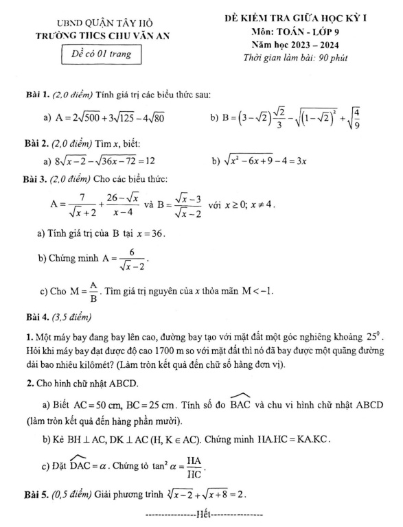 Đề thi môn toán giữa kỳ 1 lớp 9 tại trường THCS Chu Văn An – Hà Nội | năm học 2023-2024