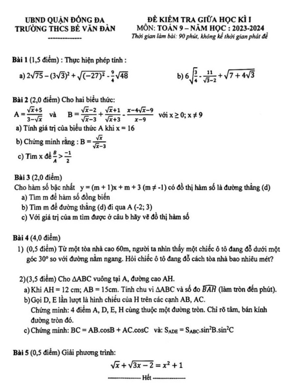 Đề thi môn toán giữa kỳ 1 lớp 9 tại trường THCS Bế Văn Đàn – Hà Nội | năm học 2023-2024