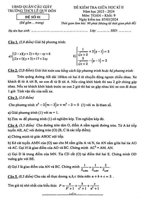 Đề thi môn toán giữa kỳ 2 lớp 9 tại trường THCS lê Quý Đôn – Hà Nội | năm học 2023-2024