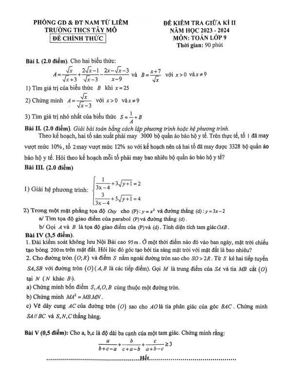 Đề thi môn toán giữa kỳ 2 lớp 9 tại trường THCS Tây Mỗ– Hà Nội | năm học 2023-2024