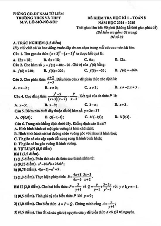 Đề kiểm tra cuối kỳ 1 môn Toán lớp 8 trường M.V. Lômônôxốp | năm học 2024-2025