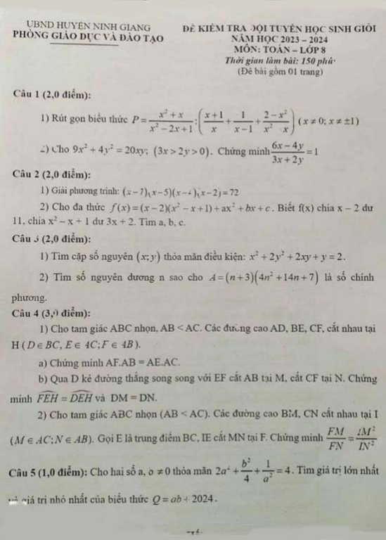 Đề thi chọn HSG môn Toán lớp 8 kèm đáp án Huyện Ninh Giang - Hải Dương | năm học 2023-2024