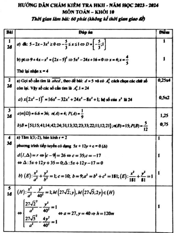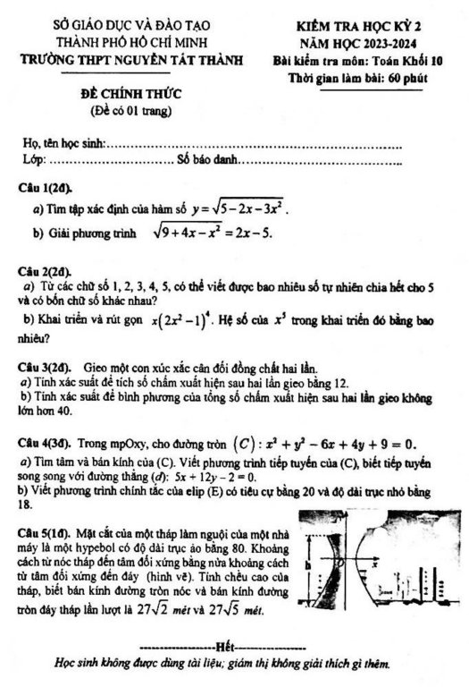 Đề thi cuối học kỳ 2 môn Toán 10 trường THPT Nguyễn Tất Thành - Hồ Chí Minh | năm học 2023-2024