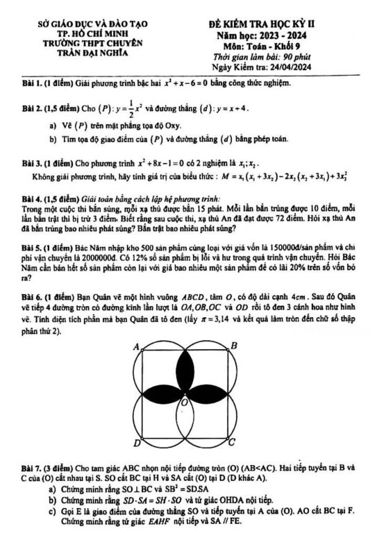 Đề thi cuối học kỳ 2 môn Toán 9 trường chuyên Trần Đại Nghĩa - Hồ Chí Minh | năm học 2023-2024