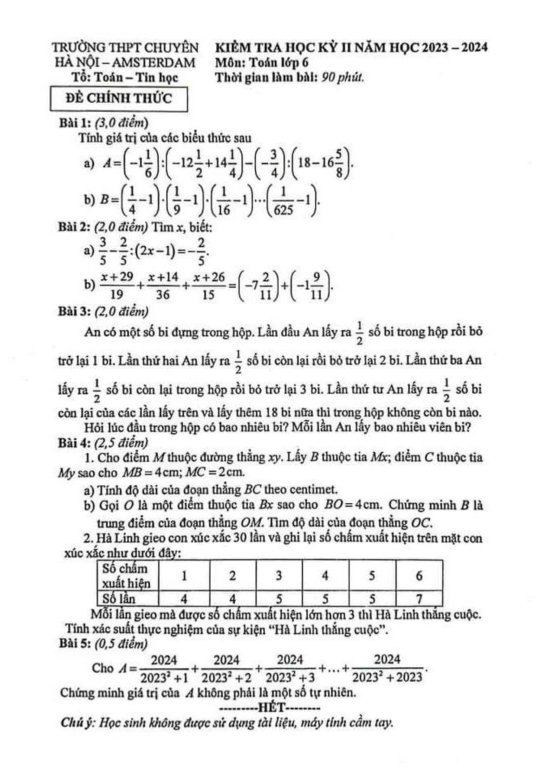Đề thi cuối học kỳ 2 môn Toán 6 trường THCS THPT chuyên Hà Nội - Amsterdam | năm học 2023-2024
