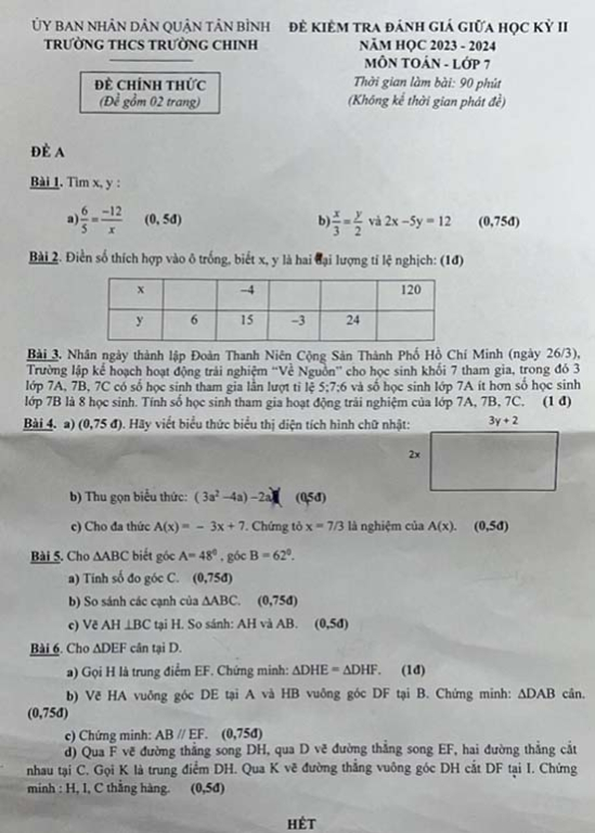 Đề thi giữa học kỳ 2 môn Toán 7 trường THCS Trường Chinh - Hồ Chí Minh | năm học 2023-2024