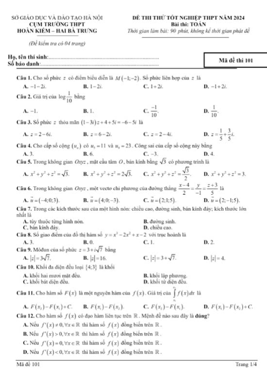 Đề thi thử tốt nghiệp THPT môn Toán kèm đáp án cụm Hoàn Kiếm & Hai Bà Trưng | năm học 2024-2025