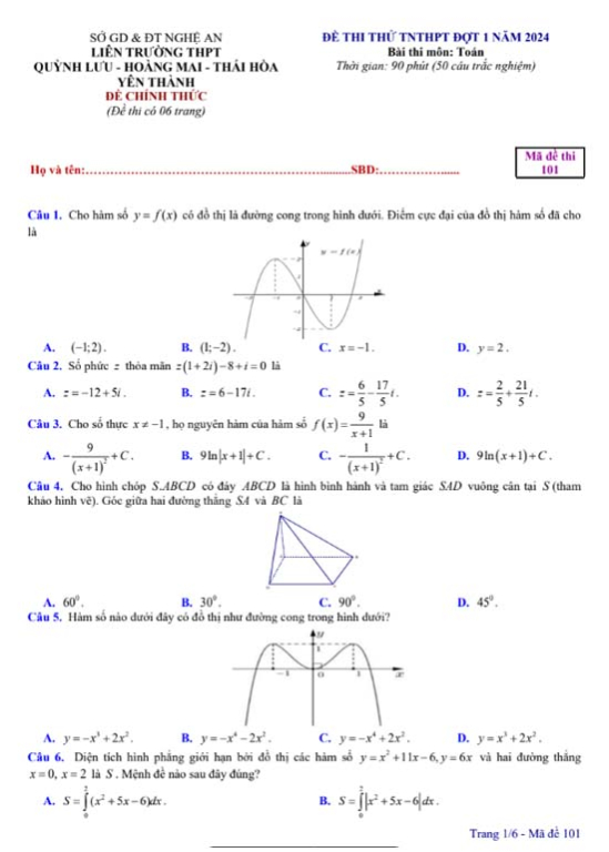 Đề thi thử tốt nghiệp THPT hình thức trắc nghiệm môn Toán lớp 12 năm học 2023 - 2024 của sở GD&ĐT Nghệ An