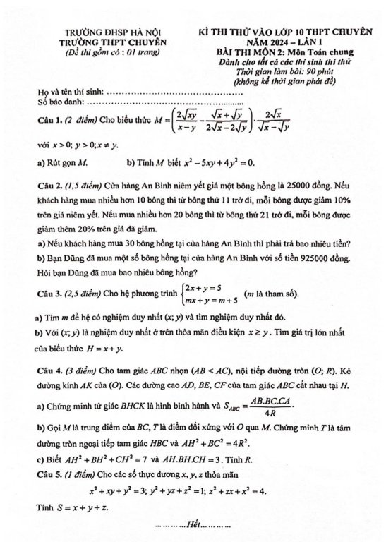 Đề thi thử môn Toán vào lớp 10 trường chuyên ĐHSP Hà Nội | năm học 2024-2025